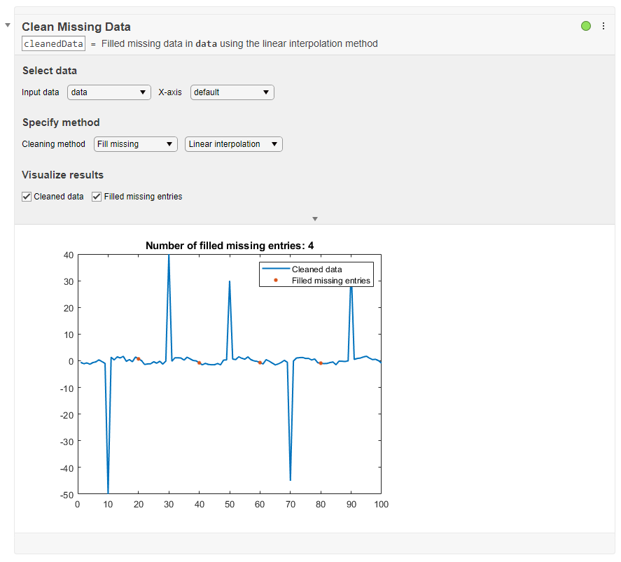 要替换数据中的 NaN 值并可视化结果,请打开清理缺失数据任务。首先在代码块中键入关键字 missing,然后当 Clean Missing Data 出现在菜单中时点击它。选择输入数据和清理方法,以自动绘制填充的数据。