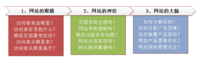 首先,网站分析是网站的眼睛。是从网站的营销角度看到的网站分析。在这 部分中,网站分析的主要对象是访问者,访问者在网站中的行为以及不同流量之 间的关系。