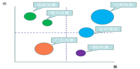 X 轴代表量,指网站获得的访问量。Y 轴代表质,指可以促进网站目标的事 件次数(比如商品浏览、注册、购买等行为)。圆圈大小表示获得流量的成本。