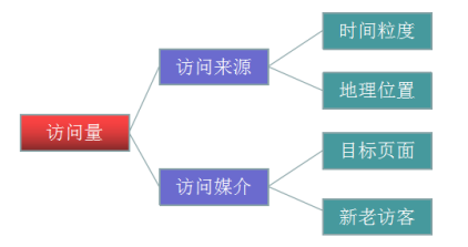 指标是访问量,就是我们常说的流量。在来源维度、媒介维度、时间维 度、位置维度等维度下,我们可以对访问量进行单独或者重叠的多维度细分。