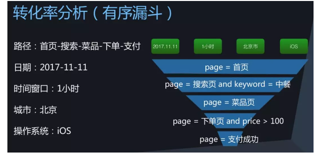统计上有一些维度约束,比如日期,时间窗口(整个访问过程在规定时间内完成,否则统计无效),城市或操作系统等,因此这也是一个典型的OLAP分析需求。此外,每个访问节点可能还有埋点属性,比如搜索页上的关键词属性,支付页的价格属性等。从结果上看,用户数是逐层收敛的,在可视化上构成了一个漏斗的形状,因此这一类需求又称之为“有序漏斗”。