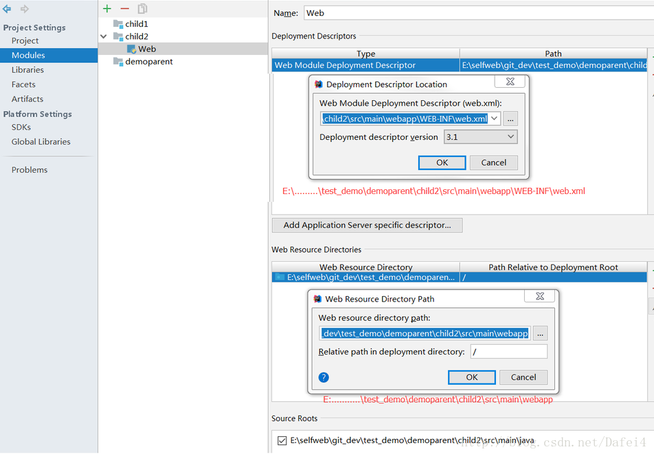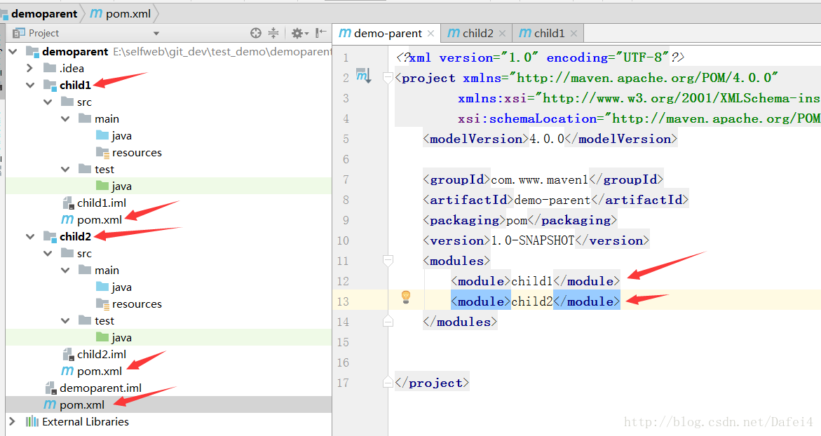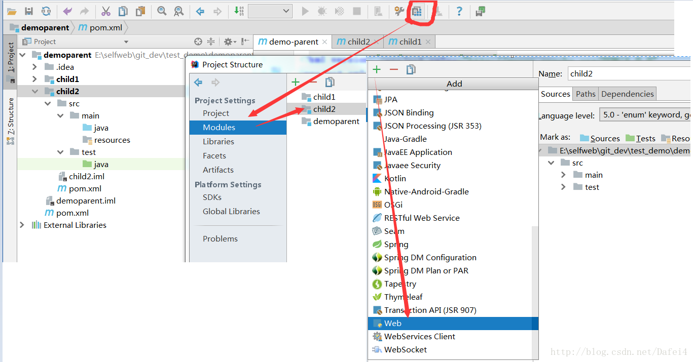 5、这个时候创建的不管是child1还是child2都是普通的Java项目,而不是JavaWeb项目,在一个JavaWeb项目中,我们的模块可能分为commons-utils、dao、service、web等几个模块,这些模块中除了web模块是web项目结构,其他模块都是普通的Java项目,本例中我就假设child1为普通项目,child2为web项目,我们看看如何将child2改造为一个web项目。