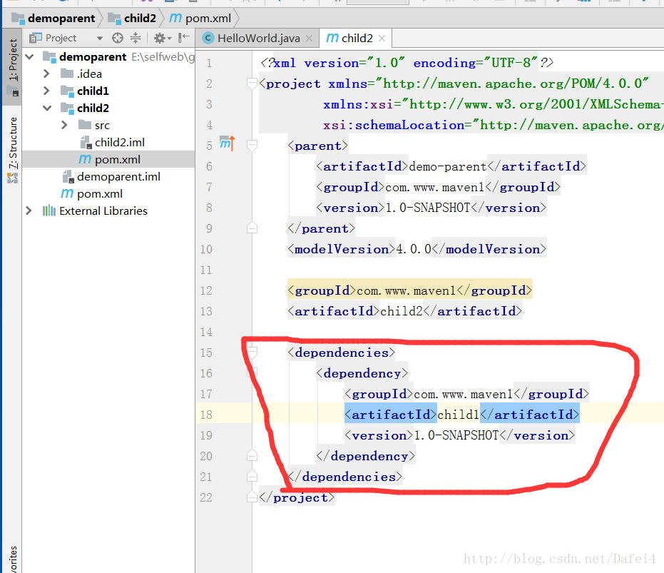 b、在child2中应用child1模块,修改child2的pom.xml文件: