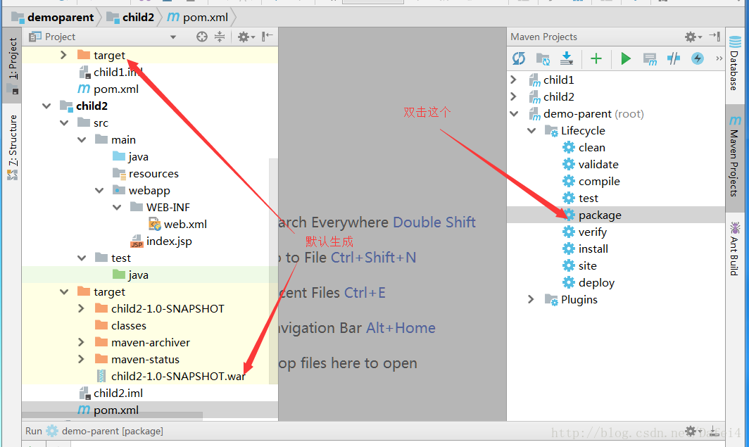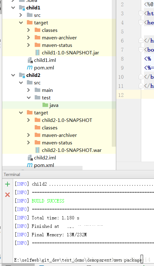 并修改child2中pom,使生成war文件,child1不用修改默认生成jar文件: