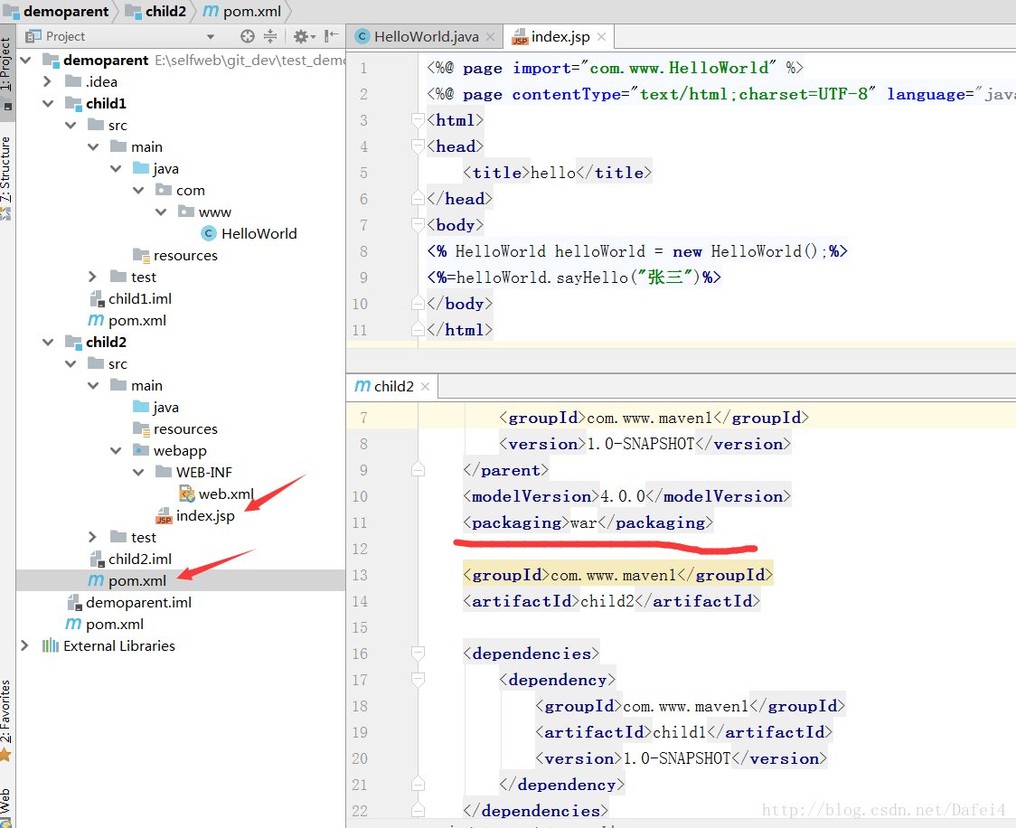 c、在child2中创建index.jsp,调用child1模块中的方法,
