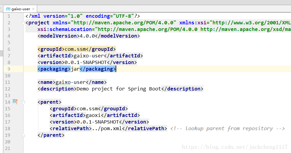4.创建好Gaoxi-user后,修改pom文件,可以将本模块中的所以依赖都删除,只需要依赖父模块即可,依赖后,会直接引用父模块中的依赖。