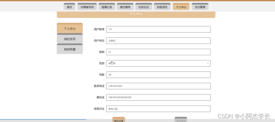 个人中心;在个人中心页面通过填写用户账号、用户姓名、密码、性别、年龄、联系电话、身份证、家庭住址等内容进行更新信息等操作,并可以根据我的发布或我的的收藏进行相应的操作,如图5-7所示。