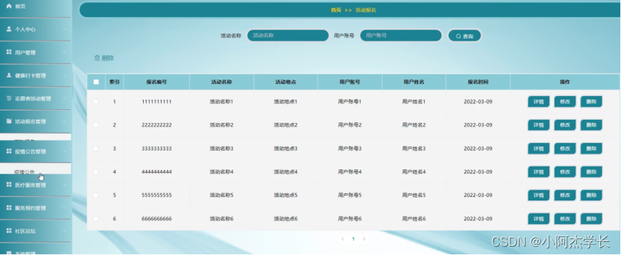 活动报名管理;在活动报名管理页面可以对索引、报名编号、活动名称、活动地点、用户账号、用户姓名、报名时间等内容进行详情、修改或删除等操作,如图5-12所示。