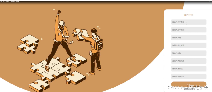 用户注册;在用户注册页面通过填写用户账号、用户姓名、密码、确认密码、年龄、联系电话、身份证、家庭住址等信息完成用户注册操作,如图5-4所示。