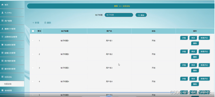 社区论坛;在社区论坛页面可以对索引、帖子标题、用户名、状态等内容进行详情、修改、查看评论或删除等操作,如图5-16所示。