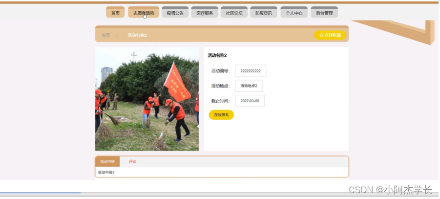 志愿者活动;在志愿者活动页面通过填写活动名称、活动编号、活动地点、截至时间等内容进行报名、评论或收藏等操作,如图5-6所示。