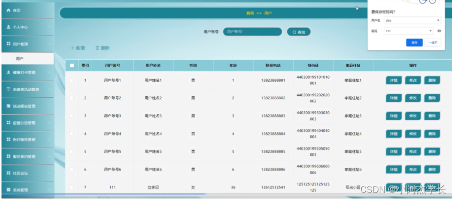 用户管理;在用户管理页面可以对索引、用户账号、用户姓名、性别、年龄、联系电话、身份证、家庭住址等内容进行详情、修改或删除等操作,如图5-9所示。