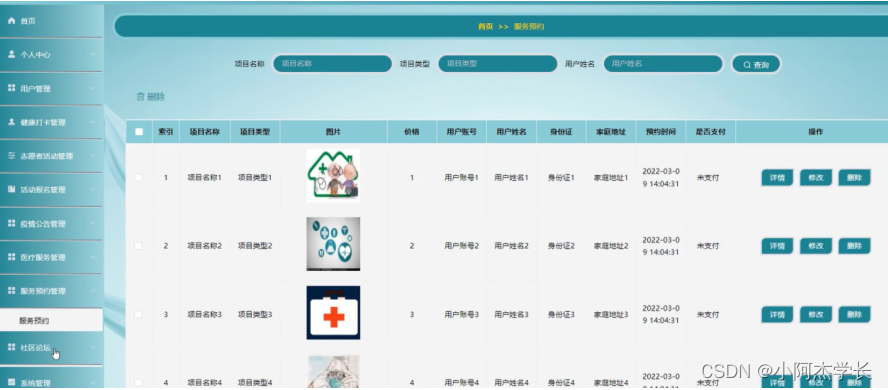 服务预约管理;在服务预约管理页面可以对索引、项目名称 、项目类型、图片、价格、用户账号、用户姓名、身份证、家庭住址、预约时间、是否支付等内容进行详情、修改或删除等操作,如图5-15所示。
