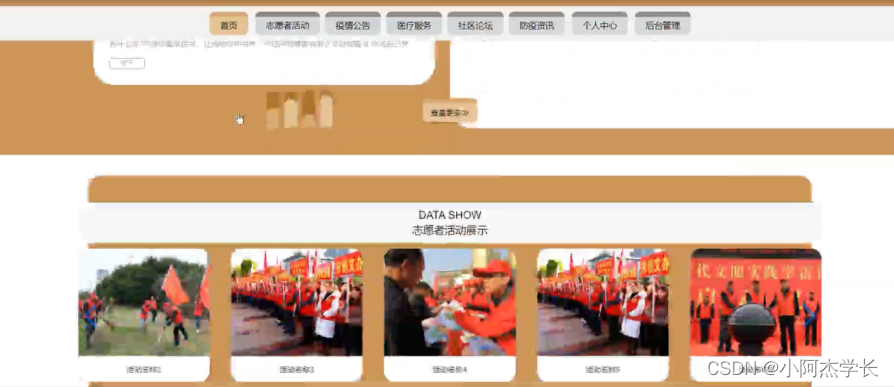 疫情社区管理系统;在系统首页可以查看首页、志愿者活动、疫情公告、医疗服务、社区论坛、防疫资讯、个人中心、后台管理等内容进行详细操作,如图5-3所示。