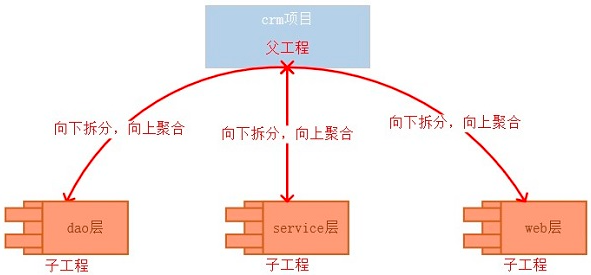 就拿一个完整的早期开发好的crm项目来说,把crm项目拆成多个子模块后,独立运行各个模块是无法完成软件项目的要求的,只有把它们都整合起来,分工合作才能完成工作。因此需要父工程来管理各个子模块,把它们聚合在一起运行,即把crm_dao、crm_service以及crm_web这三个工程打成一个独立的可运行的war包。