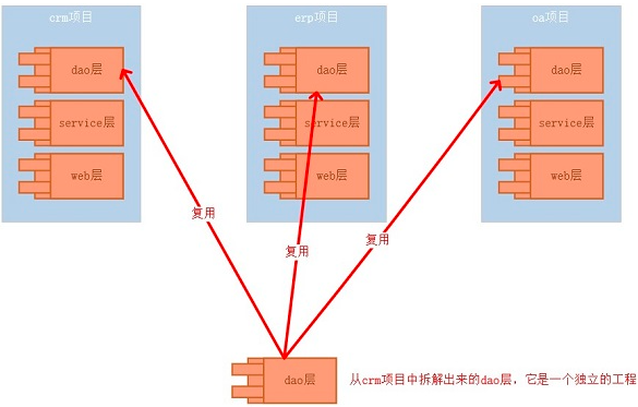 从上图可以看出,出现了一个问题,如果crm项目中dao层一旦出现bug需要修复时,erp项目与oa项目中的dao层也要做相应的修改,像这样重复的事情需要做三遍!实在是不可取,那怎么解决呢?