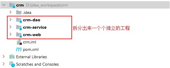 这时,就可以将crm项目中的dao层拆解出来了,并形成一个独立的工程,然后每个项目都来复用这个独立的工程。