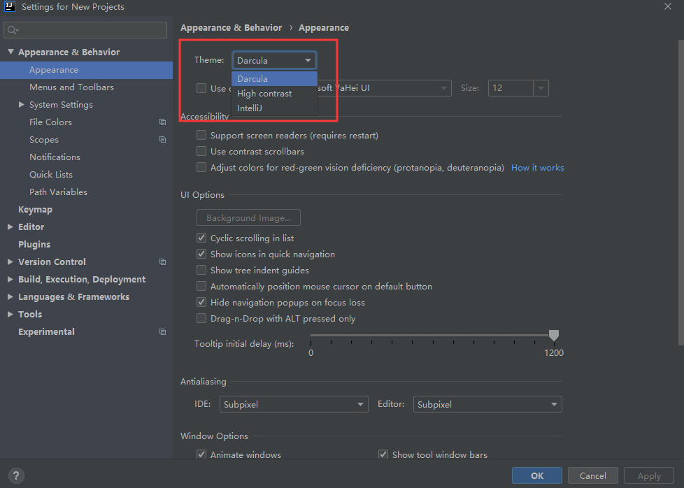 IDEA提供了三个主题供大家选择,我比较习惯黑色风格Darcula