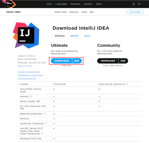 3)选择对应系统版本下载;官网上提供了 Windows,macOS 和 Linux 三个操作系统,每个系统都有两个版本可供下载: Ultimate 和 Community。