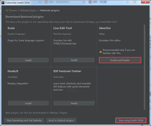 11)根据需要安装插件,这里先安装一个 IdeaVim,点击 “Install and Enable” 安装,安装完成后点击 “Start using IntelliJ IDEA”,启动 IntelliJ IDEA;