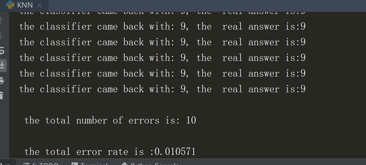 print("the classifier came back with: %d, the real answer is:%d" %(classifierResult,classNumStr))