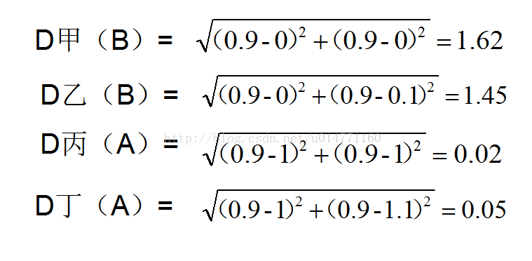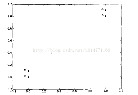 坐标轴上有四个点,从下到上分别为甲(0,0)乙(0,0.1)丙(1,1)丁(1,1.1)。又上角的两个点属于类型A,左下角的两个点属于类型B。此时如果有一个点D(0.9,0.9),那么我们判断D点属于类型A还是类型B呢(此时只有两个类型:A和B)。聪明的你肯定一下就能看得出来是类型A,那么为什么呢?猜的?那你太厉害了吧,其实在不经意中你已经用到了K-近邻算法的思想,好了我们下面就用K-近邻的思想来解释一下为什么属于类型A吧。