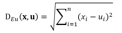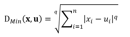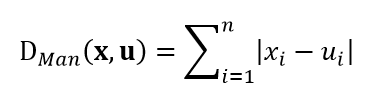 既然样本可以被认为是在度量空间内分布,那么我们就可以用距离测度来衡量它们的相似程度。常用的距离测度包括欧氏距离和曼哈顿距离,以及更一般的明氏距离,式1~式3分别给出了测试样本u和训练样本x的这三种距离公式: