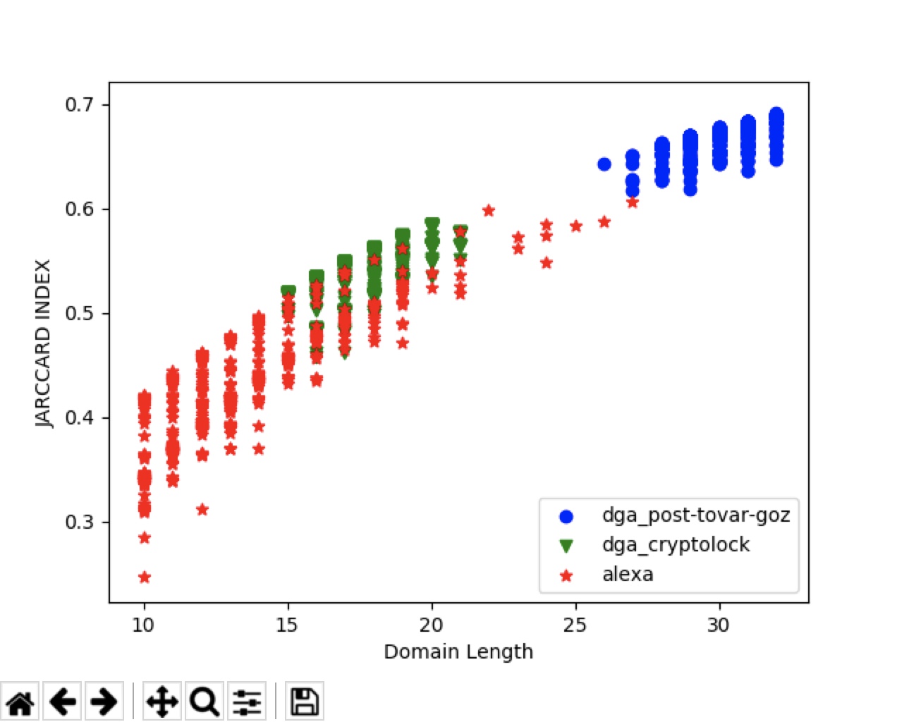 ax.scatter(x_2, y_2, color='g', label="dga_cryptolock",marker='v')