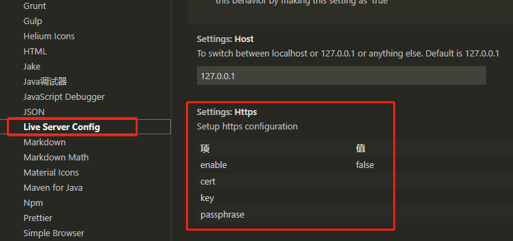 找到 Live Server > Settings: Https 目录,并设置图中的项和值