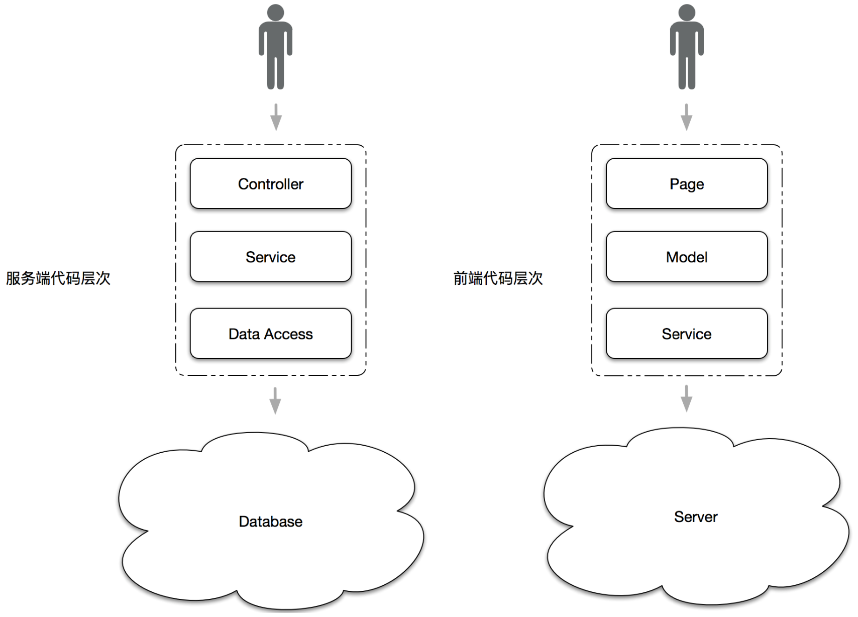 上图中,左侧是服务端代码的层次结构,由 Controller、Service、Data Access 三层组成服务端系统: