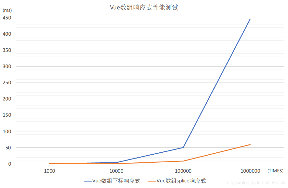 在选择 TIMES 取值的时候,也发现需要到 10000 级别才会体现出较明显的差距。但一般情况下,我们并不会执行像上面一样庞大的操作,也许仅仅只是改变一个值而已,实现下标响应式消耗的时间和普通的方式几乎一样,或许在这方面 vue 牺牲了一点开发体验。