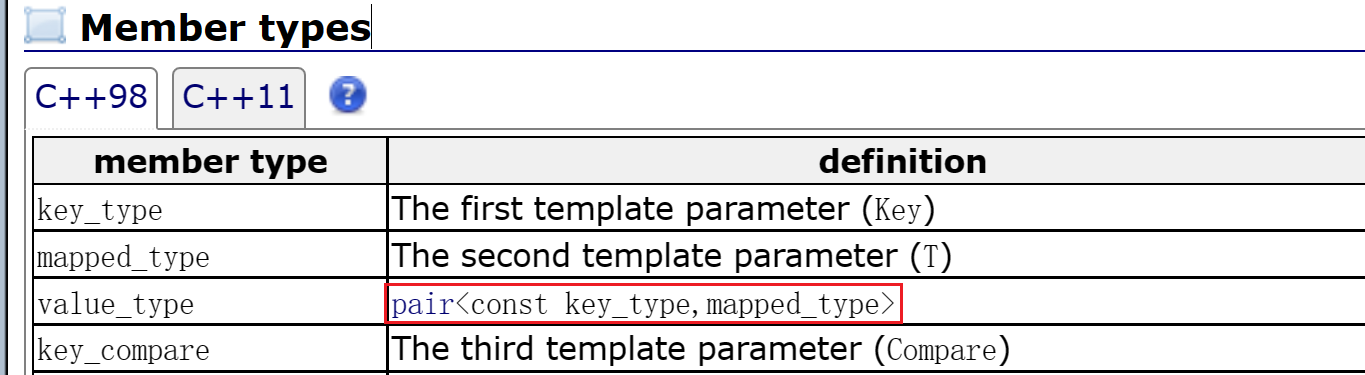 - 在map中,键值key通常用于排序和唯一的标识元素,而值value中存储与此key关联的内容。简直key和值value的类型可能不同,并且在map的内部,key与value通过成员类型value_type绑定在一起,为其取名别称为pair
