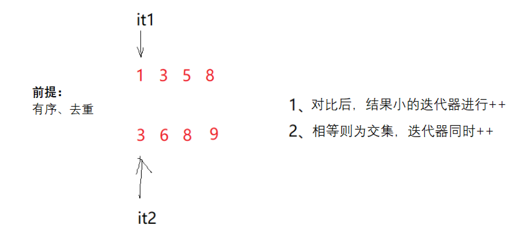 - 同时处理两个区间,让it1指向的值与it2指向的值进行比较,如果相等则为交集,两个迭代器同时向后移动,如果不相等,结果小的迭代器进行向后移动(时间复杂度:O(N))
