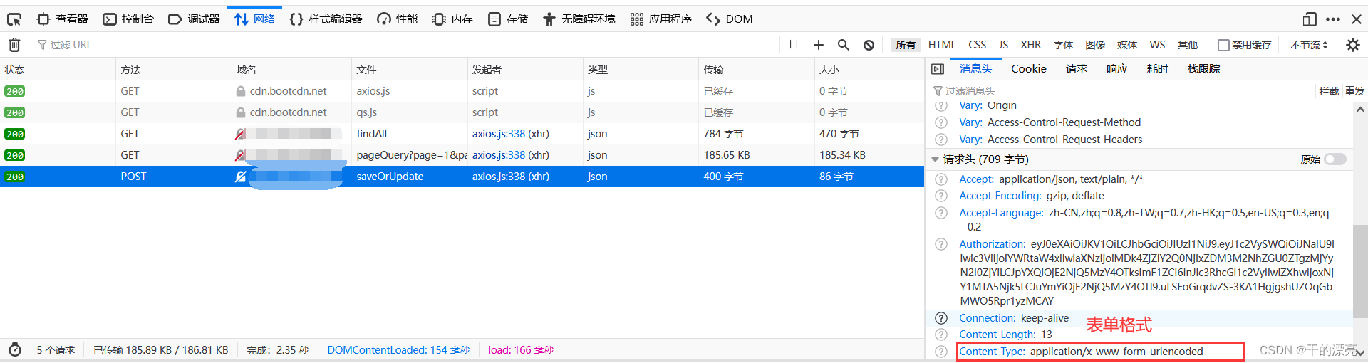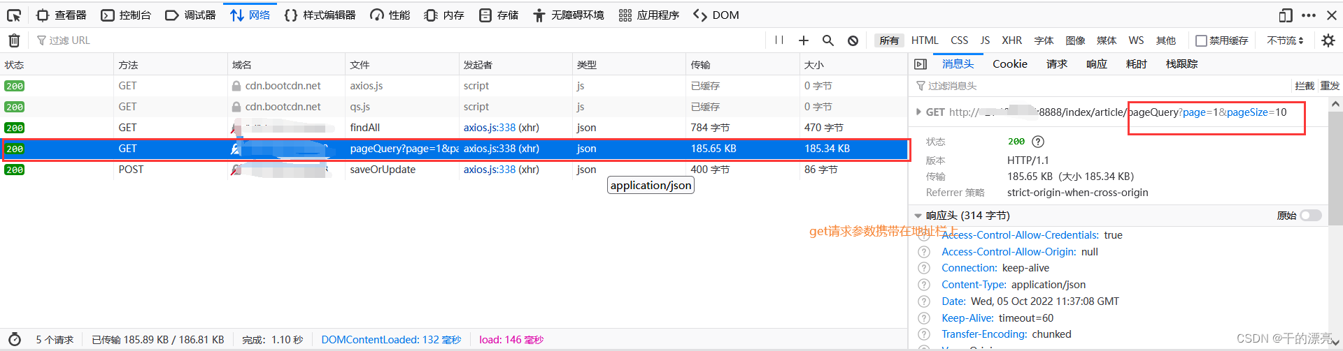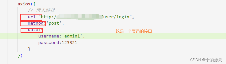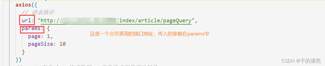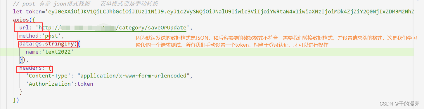 get请求和post请求都要分情况,一种是有参数,一种是没有参数,get请求的参数写在axios的配置项pramas中,post请求的参数写在axios的配置项data中,且post请求有两种数据格式,一种是JSON格式,一种是表单格式,需要手动转换,下面我们分别来看一下(我用的接口在这里打了一个马赛克,需要换成自己的接口)