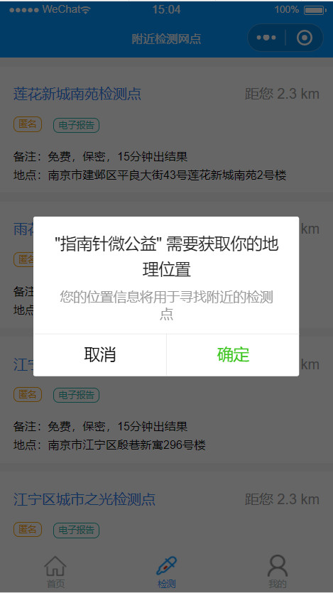 "desc": "您的位置信息将用于寻找附近的检测点"