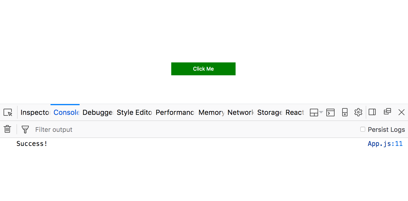 最后,我们需要定义我们的handleClick函数。 让我们首先通过单击console.log '成功!',确保一切都正确连接。 单击该按钮时。