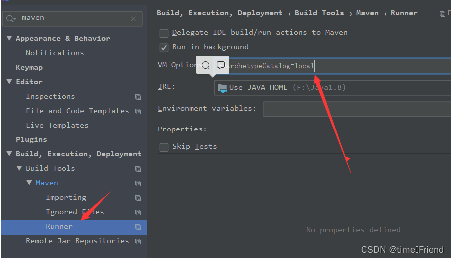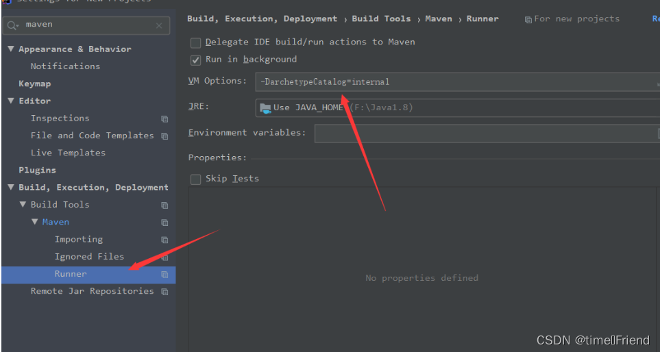 在 IDEA 的 Settings 窗口中,搜索maven,找到maven下的Runner,在VM options输入框中输入:-DarchetypeCatalog=internal 保存即可。
