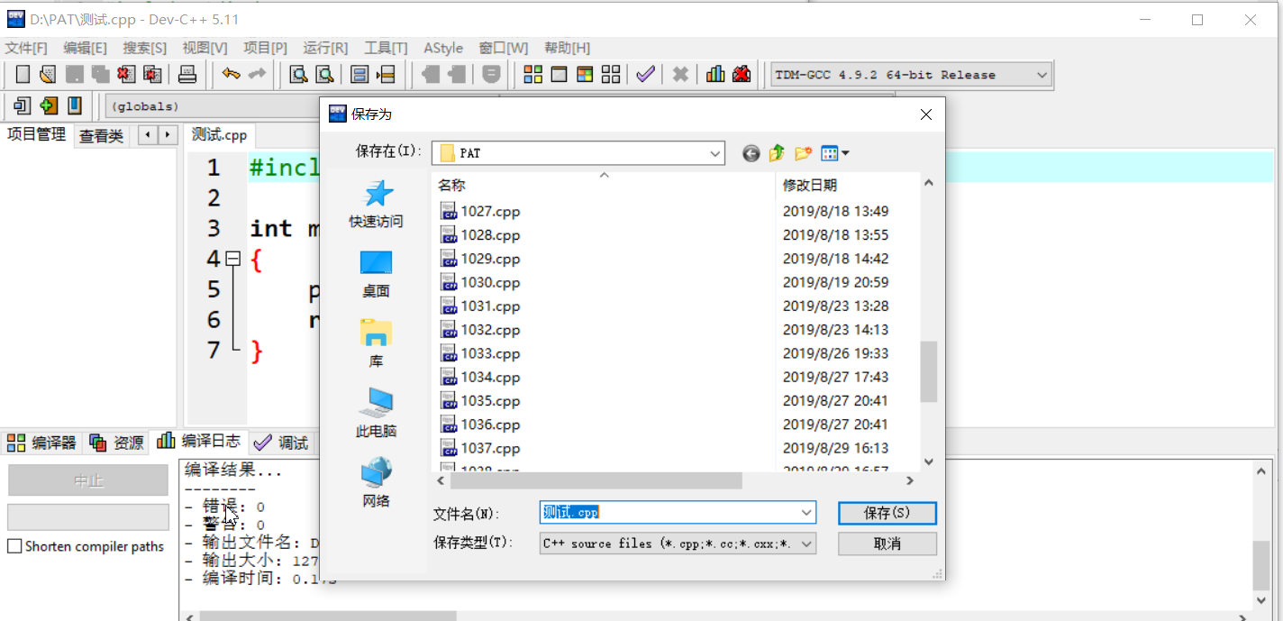 4. 按F11,或者点击编译程序并且运行得到程序执行的结果,编译前需要保存文件ctrl+S保存到相应的目录,并且命名程序的名字,后缀以.cpp结尾。