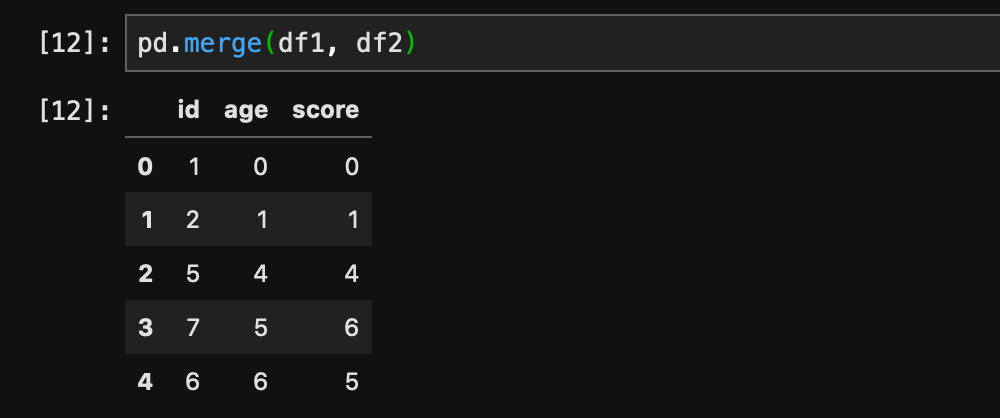 我们可以看到这两个dataframe当中都有id这个字段,如果我们想要将它们根据id关联起来,我们可以用pd.merge函数完成: