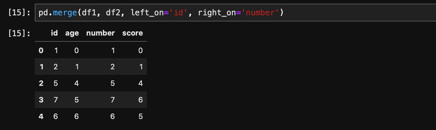 如果需要根据多列关联,我们也可以传入一个数组。但假如两个dataframe当中的列名不一致怎么办,比如这两个dataframe当中的一列叫做id,一列叫做number,该怎么完成join呢?