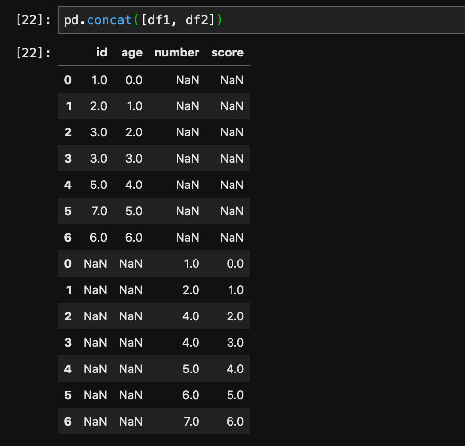 竖着拼接的时候会按照列进行对齐,如果列名对不上就会填充NaN。