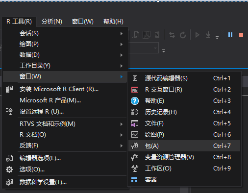 2.点击R工具-->窗口-->包,打开R语言工具包管理器