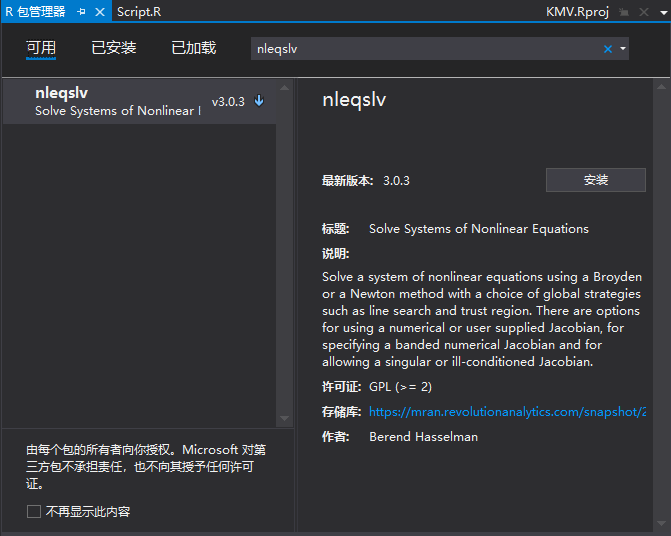 3.搜索nleqslv,它是用来求解非线性方程组的。结果如下,可以点击蓝色的↓进行下载