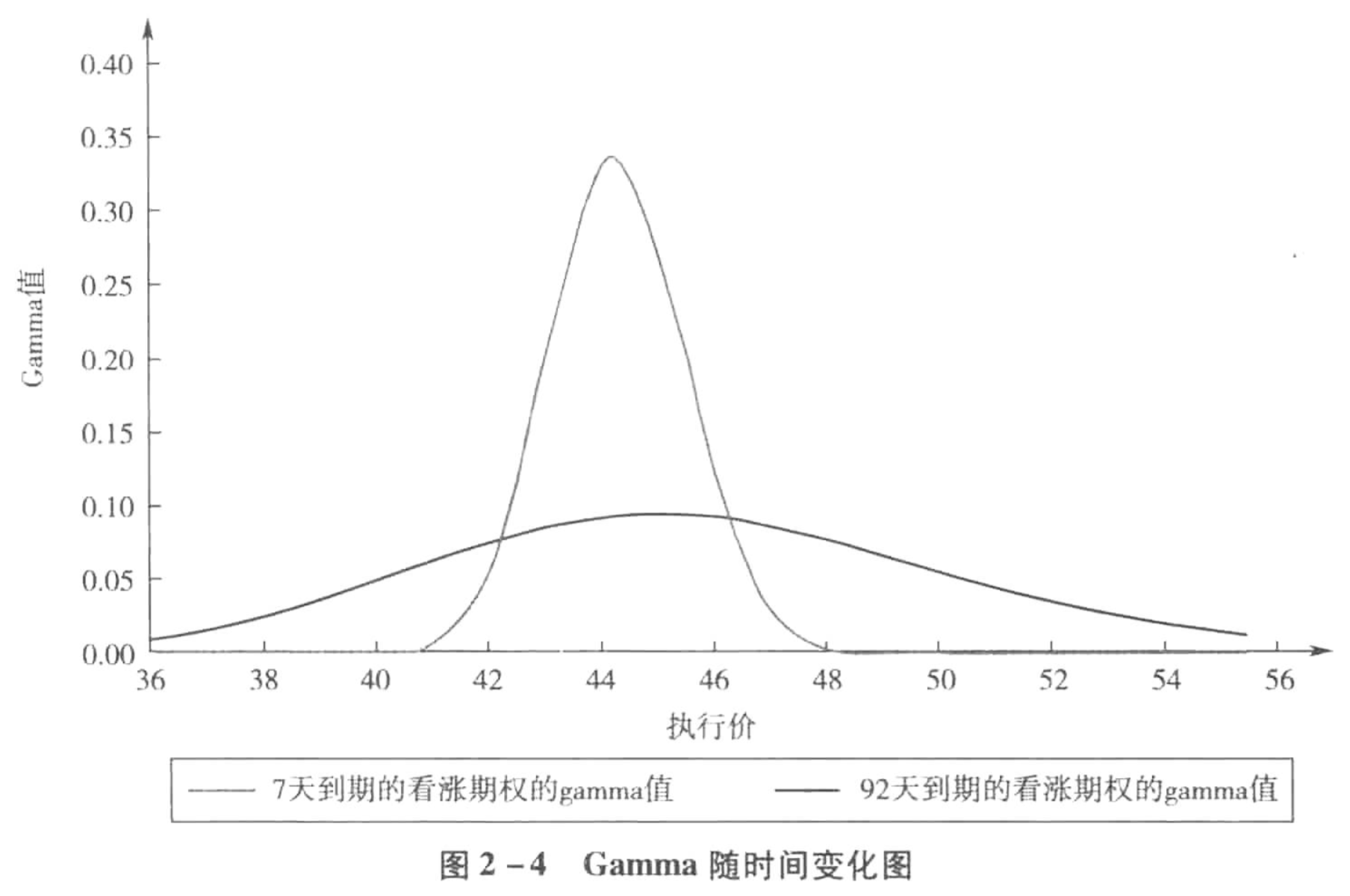 | Gamma | Delta随标的价格变动的变化率。Delta/标的价格 | 一、随着到期日邻近Gamma峰值向平价合约移动。