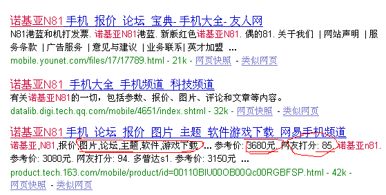 如果这样,那么你就大错特错了。关键词仅仅是一个开始,要确保SERPS(搜索引擎结果页)的友好性,这可是不可忽视的重要环节。如果你正准备买一个诺基亚n81手机,你在搜索引擎里搜索诺基亚n81得到如下三个结果,你会选哪一个能?