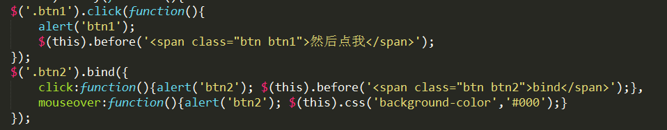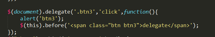 这种方式采用了事件委托的概念。不是直接为btn3元素绑定事件,而是为其父元素(或祖先元素也可)绑定事件,当在父元素内任意元素上点击时,事件会一层层从event target向上冒泡,直至到达你为其绑定事件的元素。冒泡的过程中,如果事件的currentTarget与选择器匹配时,就会执行代码。