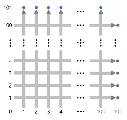 Gildong's town has a train system that has 100100 trains that travel from the bottom end to the top end and 100100 trains that travel from the left end to the right end. The trains starting from each side are numbered from 11 to 100100, respectively, and all trains have the same speed. Let's take a look at the picture below.