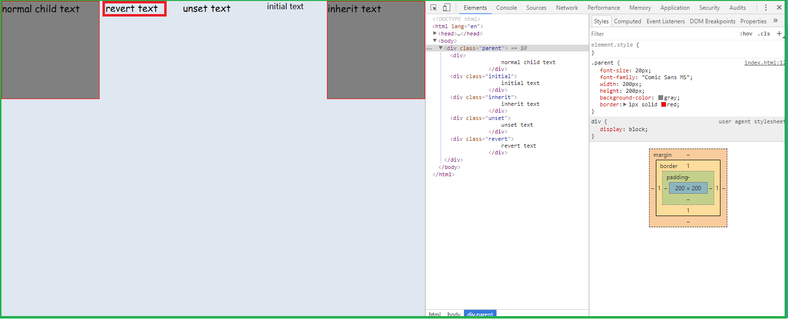 上面的例子中,我们可以看到inherit text部分与parent的样式相同。