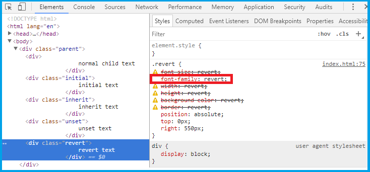 如图,原来font-family对于revert支持。当然这只是我测试的结果。