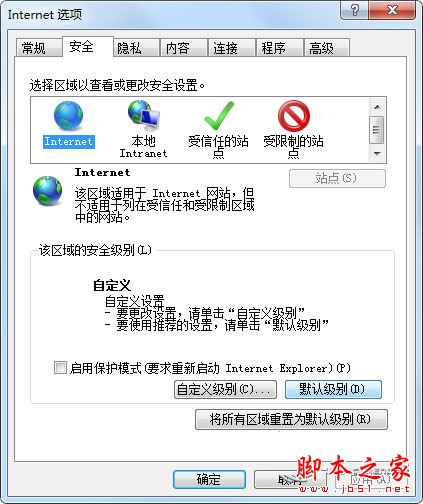 2、在打开的Internet选项设置页面中点击“安全”,然后点击点击“默认级别”;